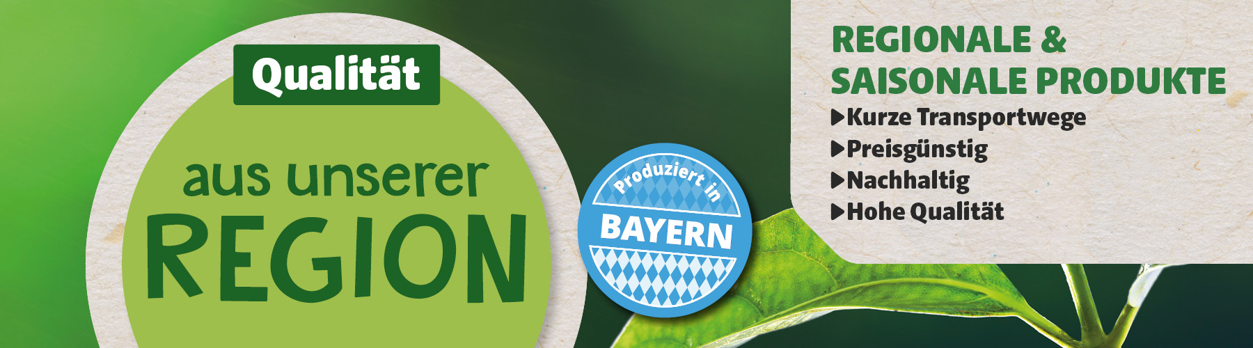 Unser Engagement einerseits „für die“ und andererseits „in der“ Region ist eine der wichtigsten Säulen unseres Erfolges und erfüllt den hohen Qualitätsanspruch unserer Kunden. Wir arbeiten möglichst eng mit regionalen Lieferanten zusammen und versuchen auch saisonale Akzente aus der Region in unseren Märkten zu setzen.